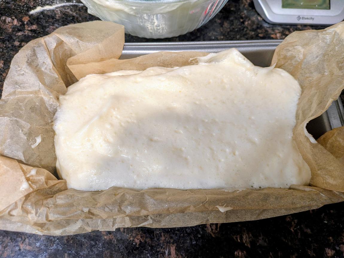 - Preheat your oven to 350F. Line a 9x5" bread pan with parchment paper, and lightly grease the paper