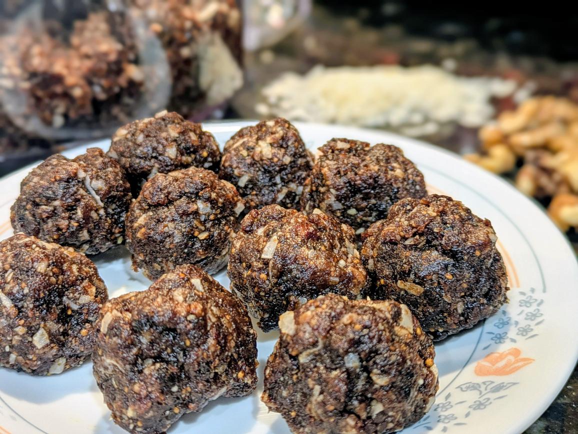 - Roll the mixture into balls (~19 g), and add to an airtight container. You should have 30 pieces. Store leftovers in the fridge or freezer