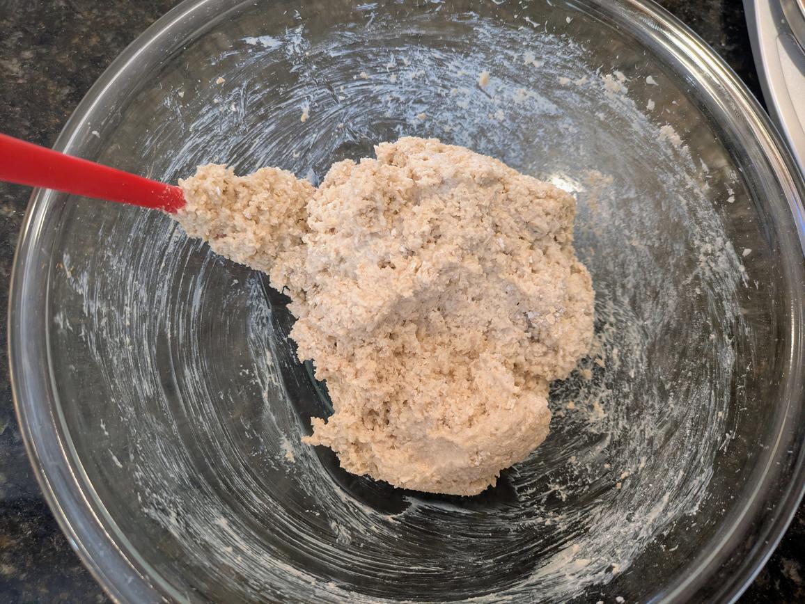 - Switch to a silicone spatula, and mix in the oat flour until fully incorporated and you have a slightly sticky dough
