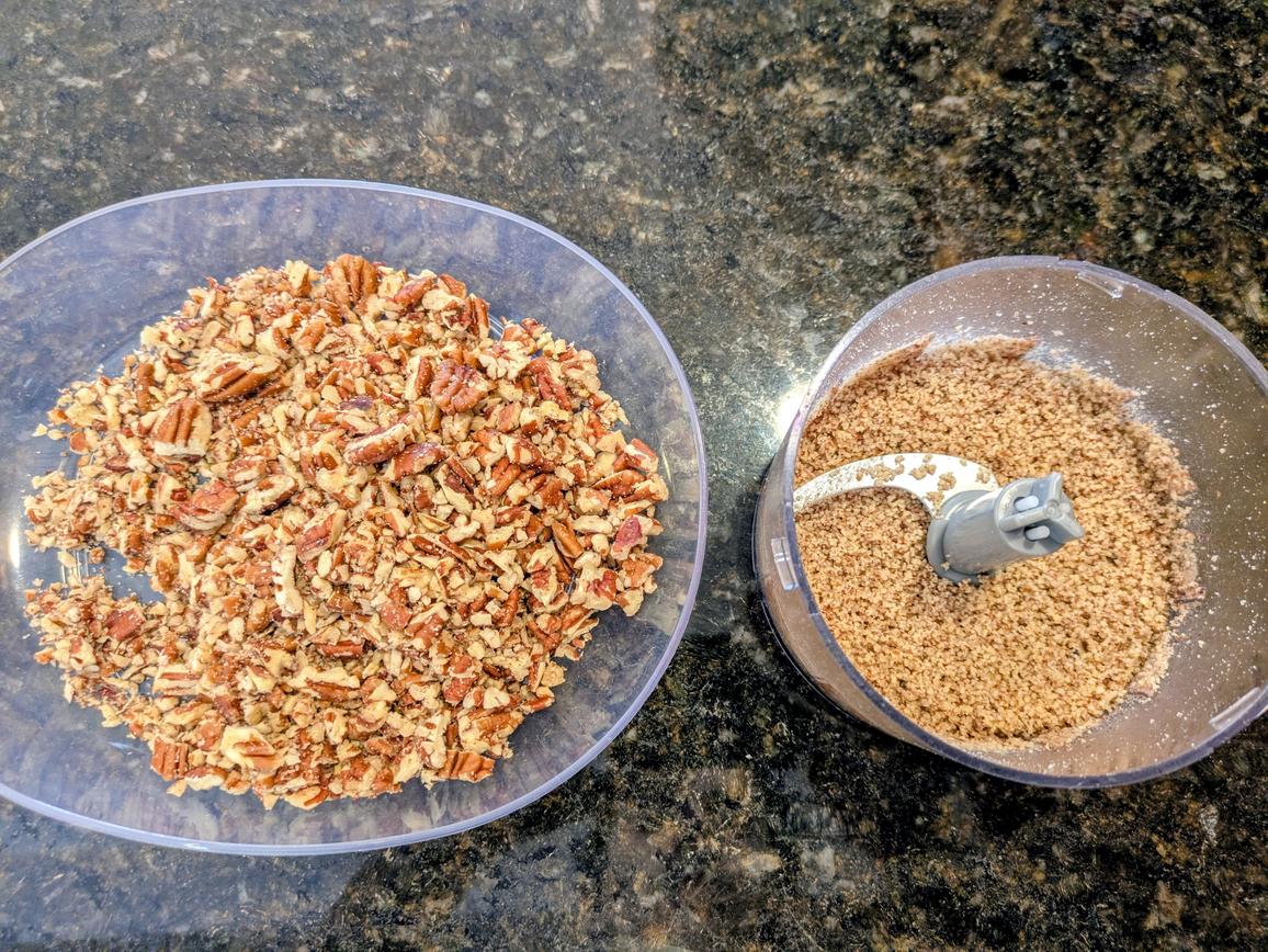 - Using a food processor, pulse 1 cup (128 g) pecans a few times, until roughly chopped, and set aside. With the remaining 1/2 cup (64 g), blend until you have a fine crumb. The former (roughly chopped pecans) will be folded into the cookie dough, whereas the latter (pecan meal) will be used for rolling prior to baking
