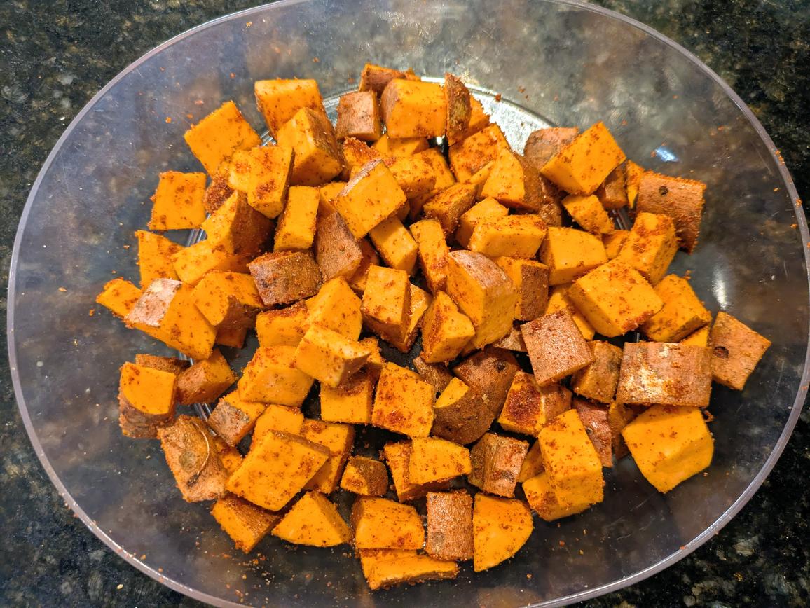 - Wash your sweet potato, and cut into a medium dice (with the skin!). Toss with the oil and spices