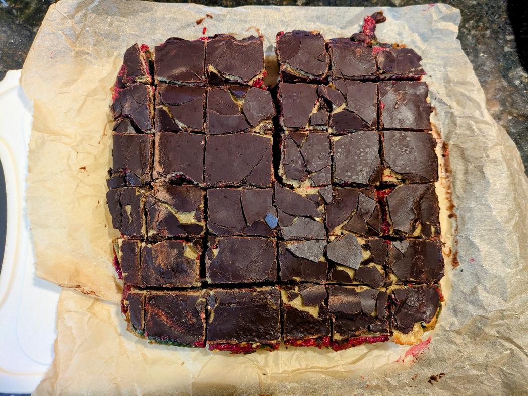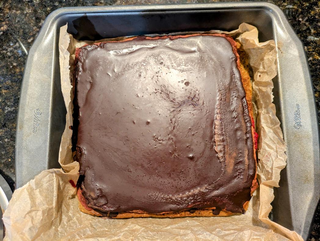 The next day, melt half your coconut oil (2 tbsp, 28 g) in the microwave, and stir in half the cocoa powder (5 tbsp, 25 g) and half the granulated monk fruit (2 tbsp, 25 g) until smooth. Evenly spread across the red layer on top in the pan. Refrigerate for at least 30 minutes to harden the chocolate