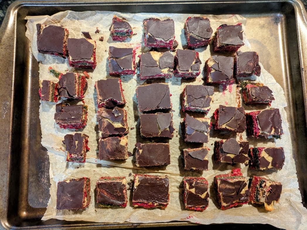 Flip over, and repeat with the other half of the chocolate on the green layer. Again, refrigerate for 30 minutes