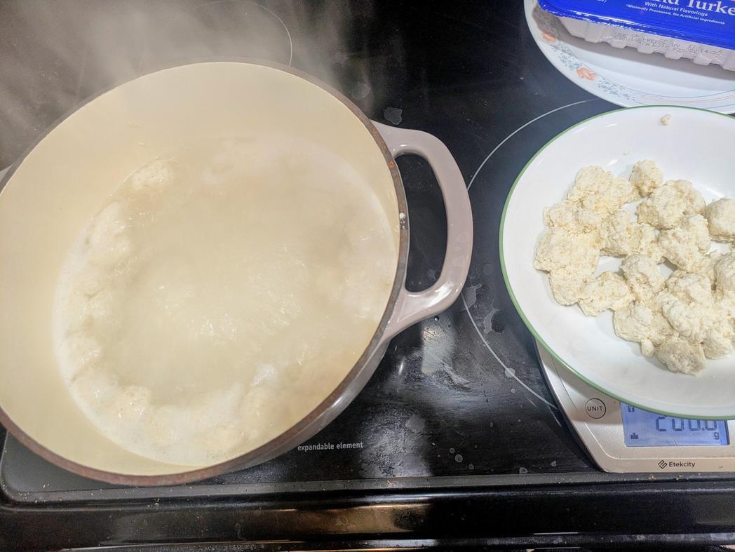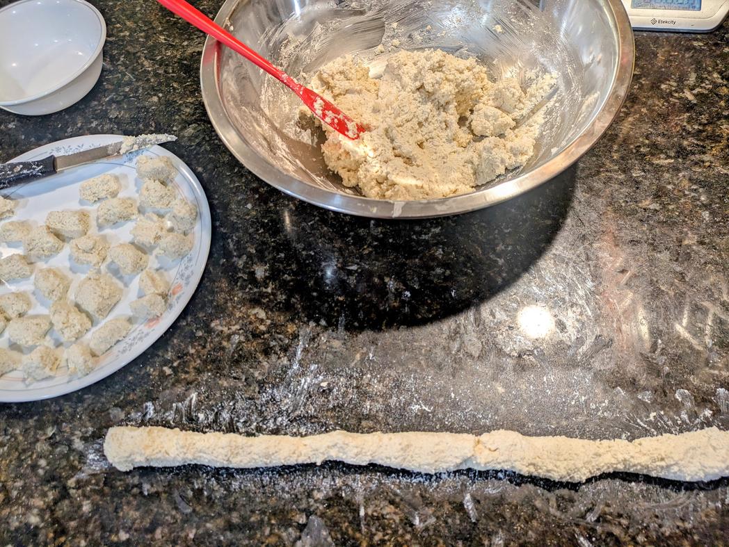 - Turn the dough onto a clean work surface. In batches, roll into a long and thin rope, and cut into 1" sized pieces