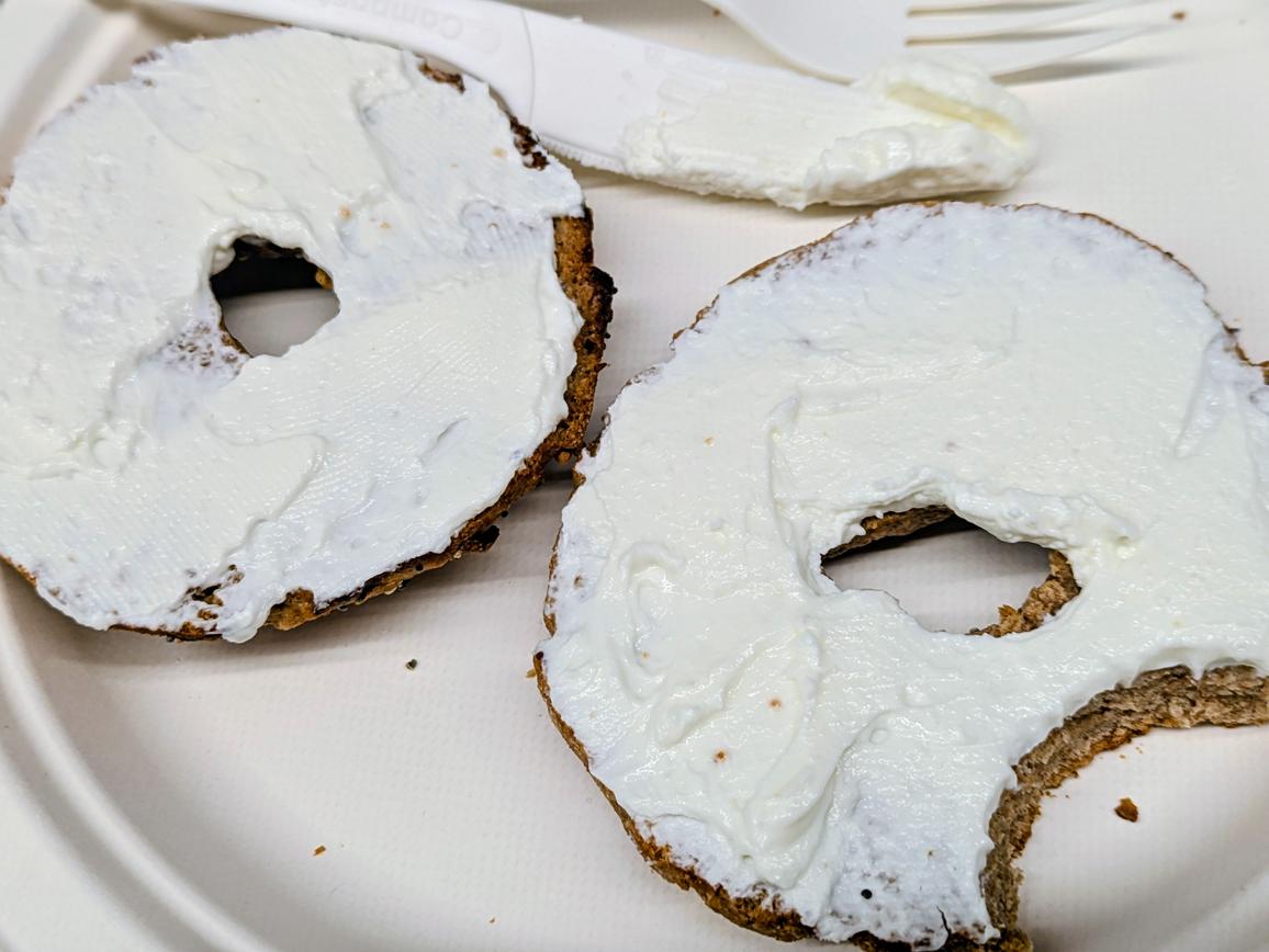 - A classic bagel option is a bagel with cream cheese, so here I spread 2 tbsp (30 g) Labneh cheese (high protein, homemade cream cheese) onto a toasted bagel