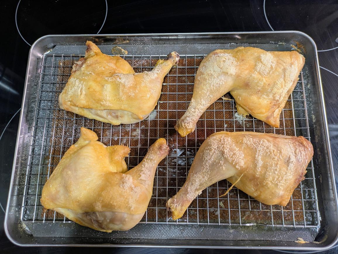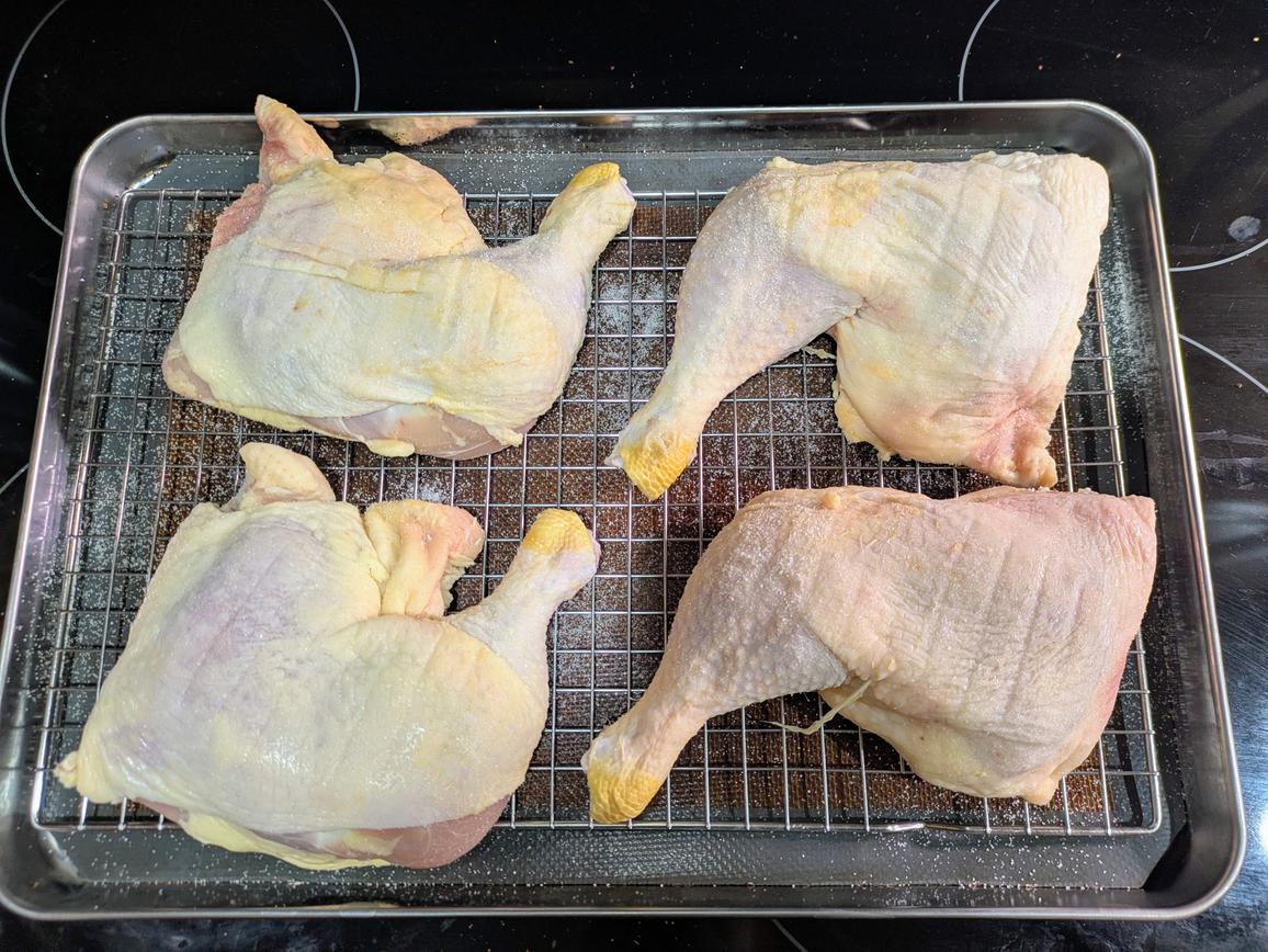Directly from the package, place the whole leg pieces onto the tray. Liberally season both sides with salt.