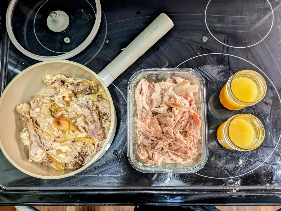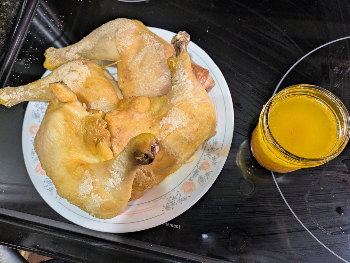 But net meat isn't the only thing we get from the leg quarters. We essentially get chicken broth and chicken fat for free, something that would typically cost much more.