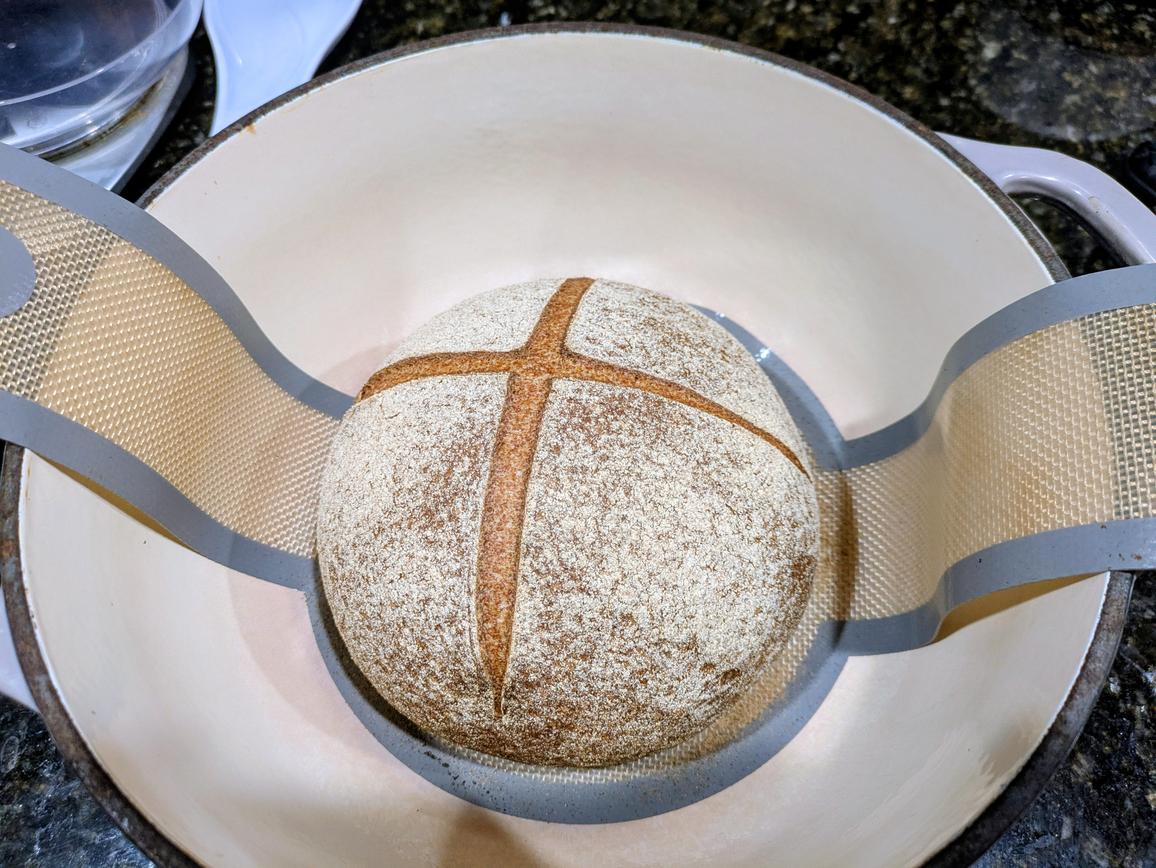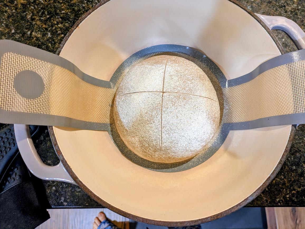 Carefully place the parchment paper (or bread sling) into the Dutch oven.