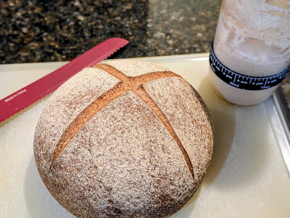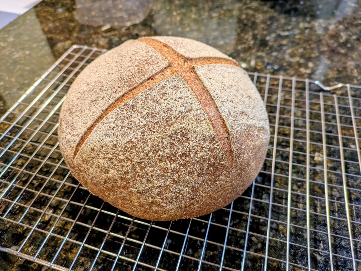 Dust the top of the dough with flour, and score the top with a razor blade into a plus sign.