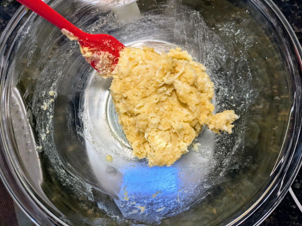 - Add in the almond flour and a beaten egg, and mix in with the spatula to make a combined and slightly sticky dough