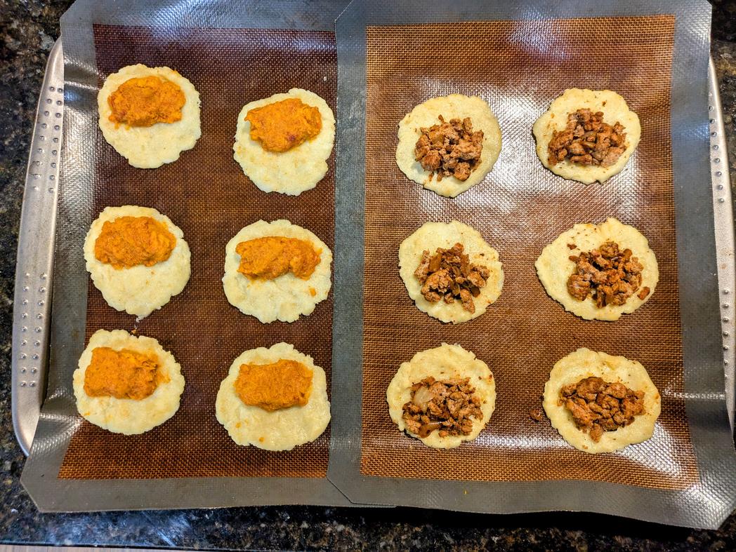 - Add filling to the bottom half of the dough circle, leaving a 1/2" border
