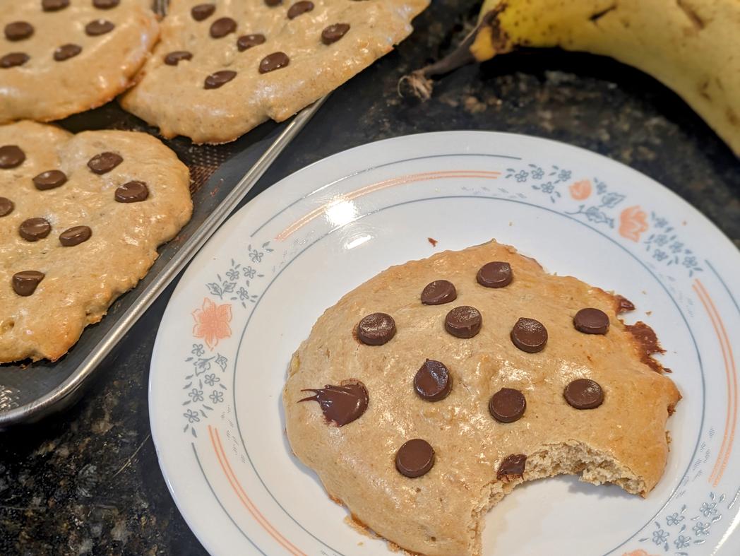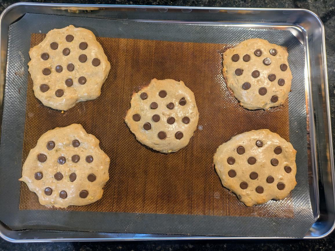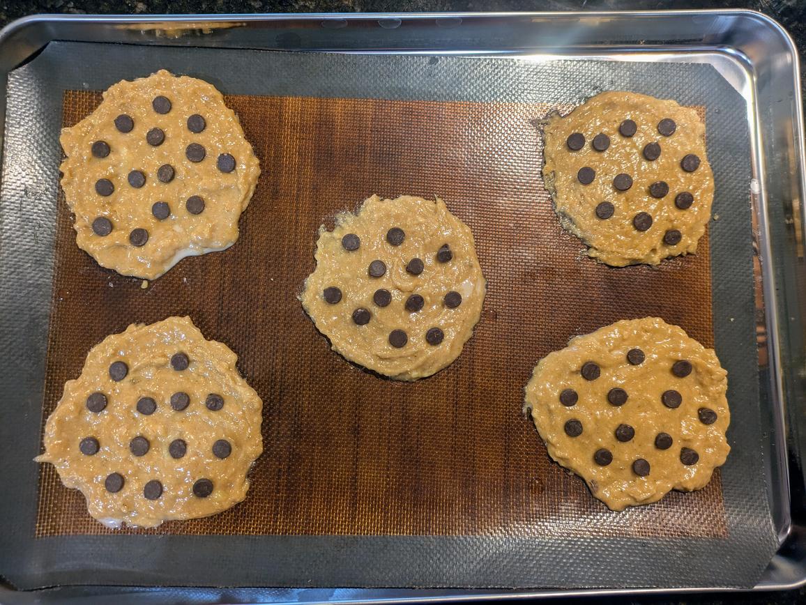 - Use a spoon to scoop the batter onto the pan, about 60 g each. Lightly wet the back of a spoon, and flatten to a 1/4" thick circle. Press the chocolate chips into the top, about 1 tsp (6 g) per cookie