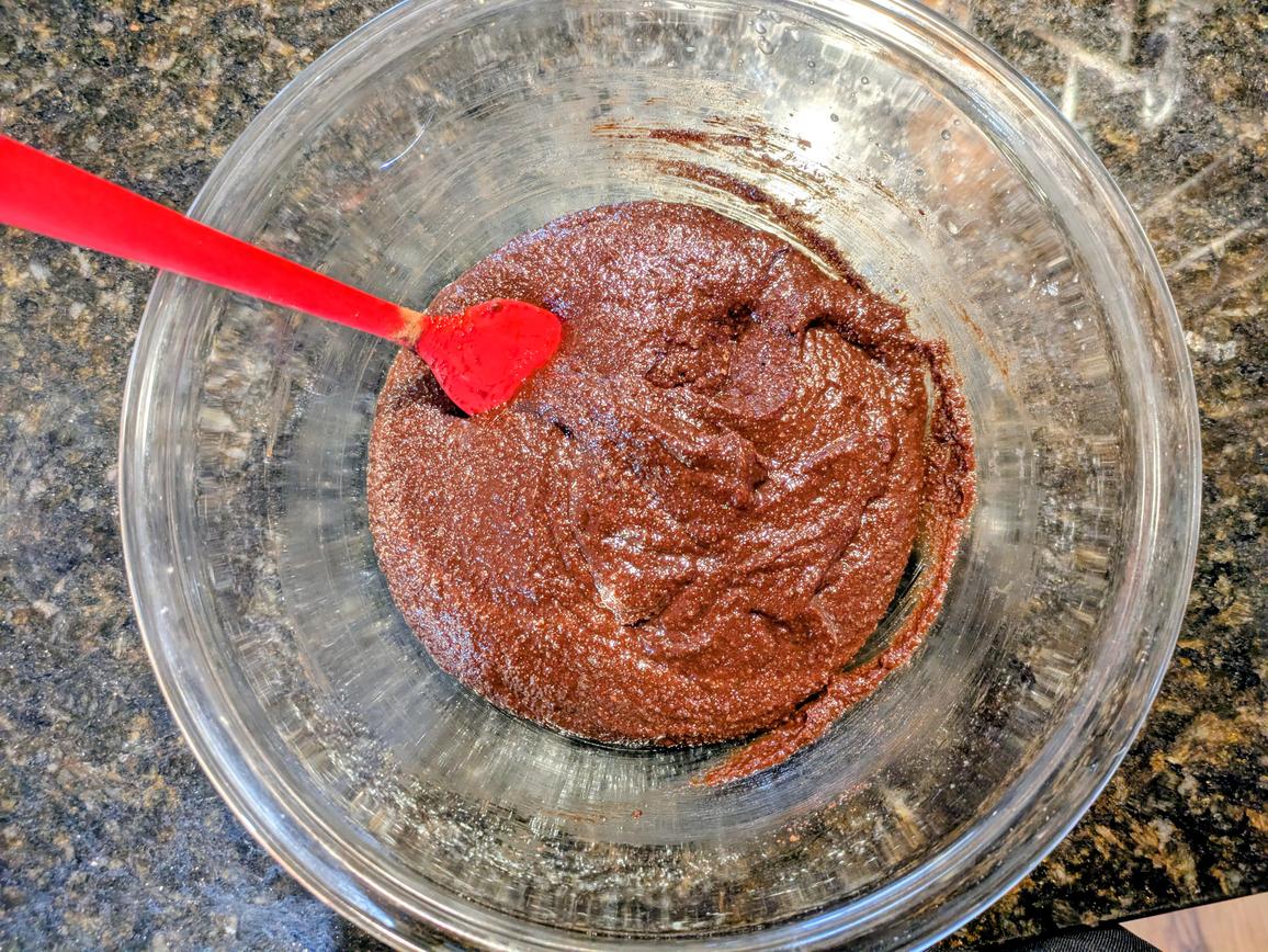 - Beat in the eggs, vanilla, and salt. Switch to a silicone spatula, and mix in the cocoa powder and almond flour