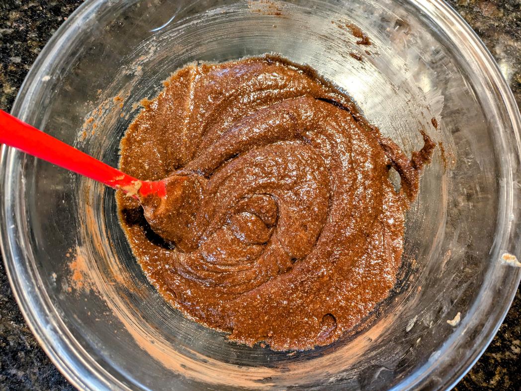 - Add in the dry ingredients (baking powder, cocoa powder, and almond flour), and mix with a silicone spatula until fully combined