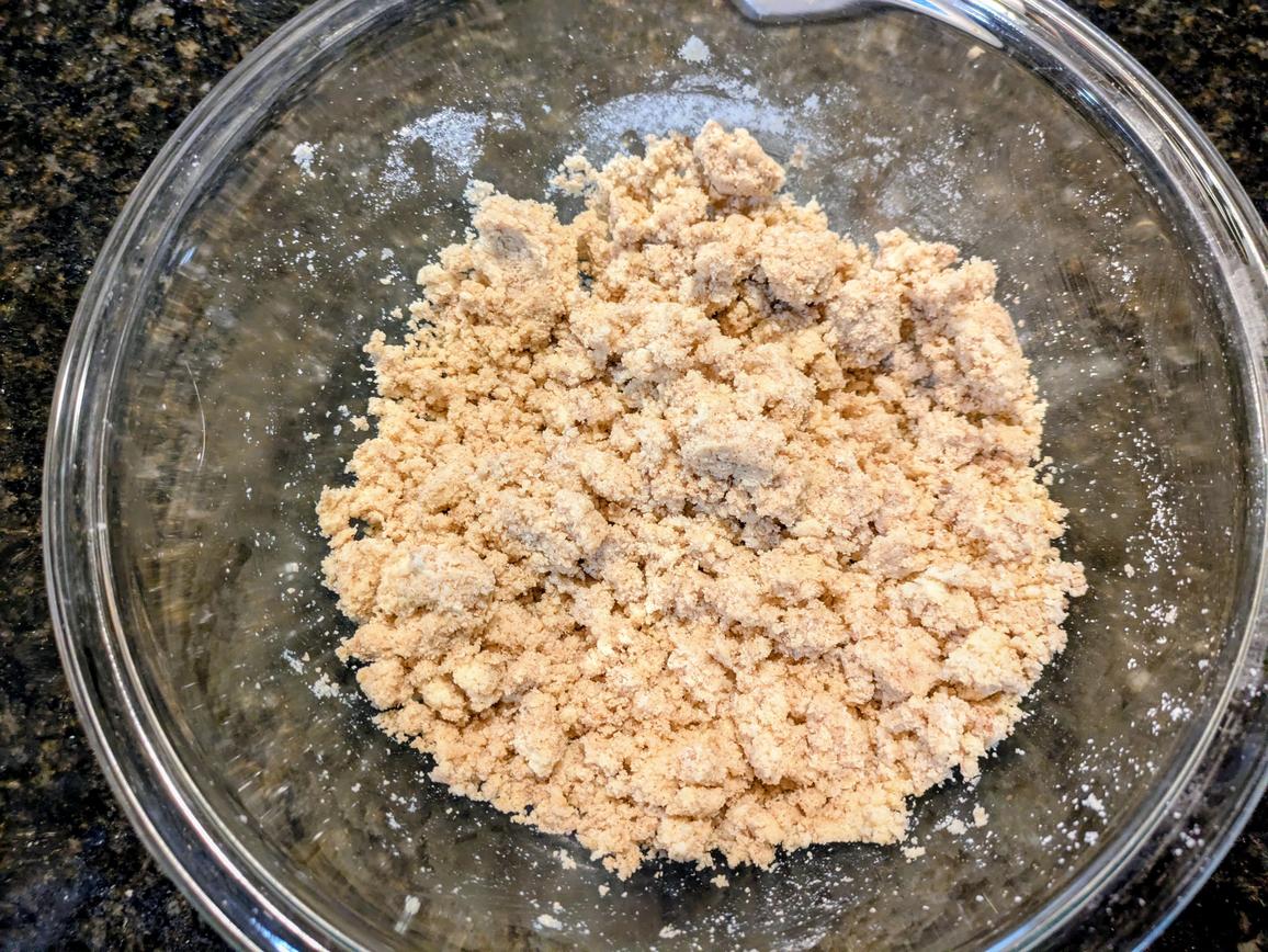 - The dough should look a little dry, but come together when pressed. Add your crust ingredients into the pan. Evenly press down into all sides. Bake at 350F for about 20 minutes, or until lightly browned. Let cool totally before adding the filling on top, or you can rip the base when spreading on the filling