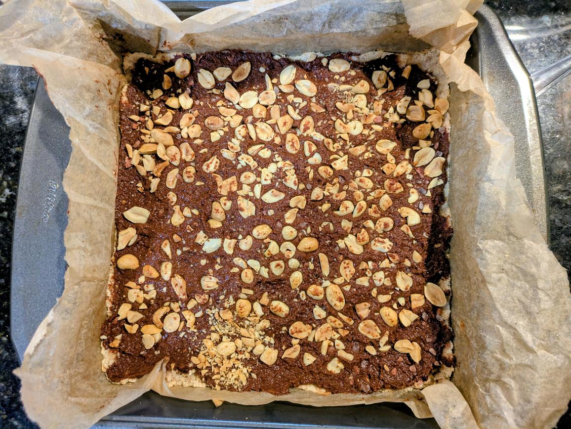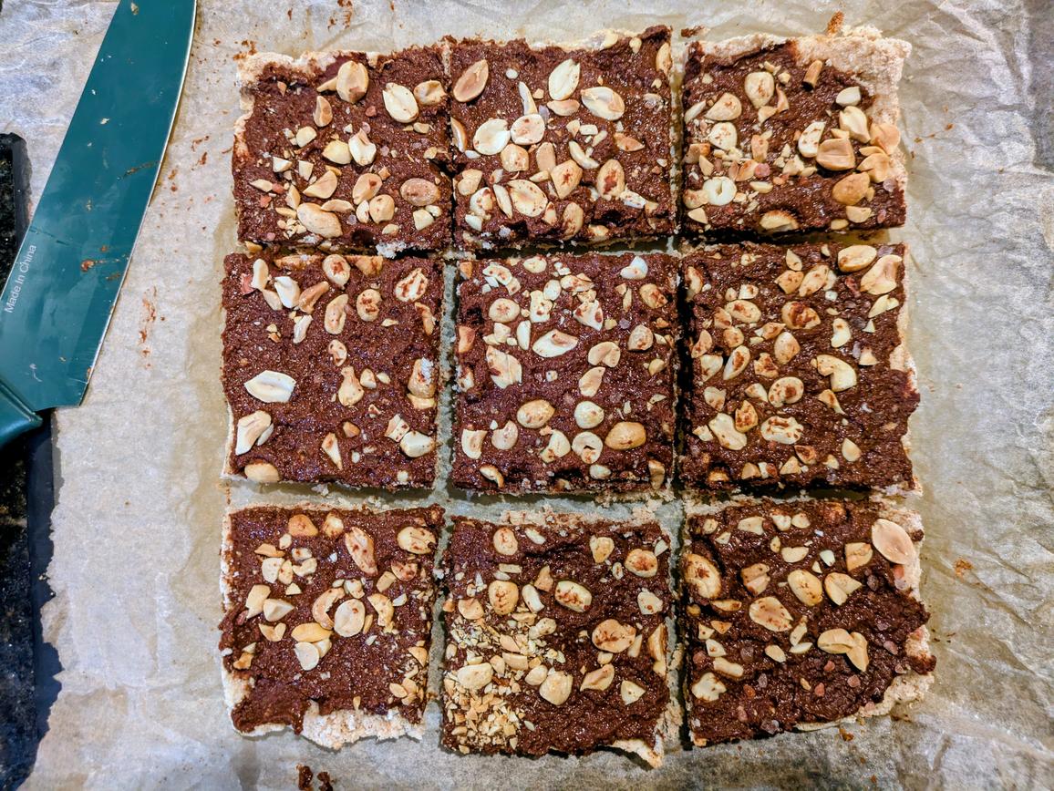 Here's a great pre or post workout snack. These bars are made of a coconut flour based crust, filled with a chocolate peanut butter spread, and topped with chopped nuts. The coconut flour and carob supply fiber for healthy digestion, the peanuts and powdered peanut butter add healthy fats and protein for satiety, and the unsweetened applesauce and liquid monk fruit add natural sweetness without any added sugar. The chocolate filling and crunchy peanut topping gives off the vibes of a healthy Snicker's bar.
