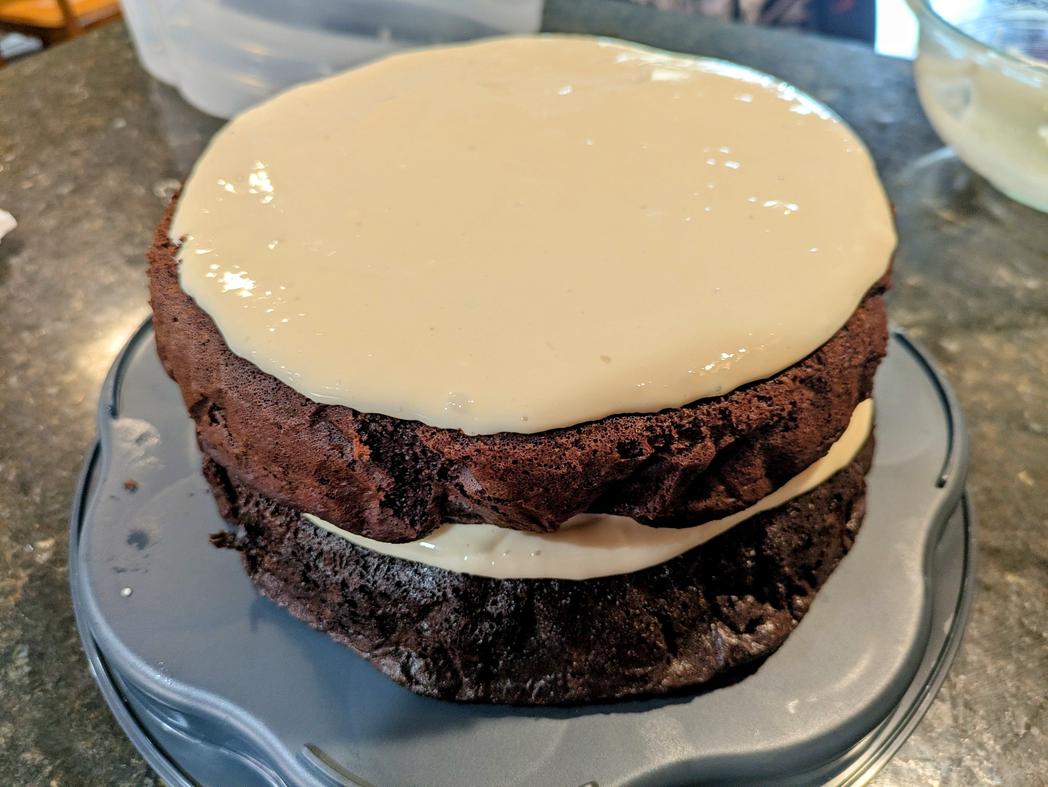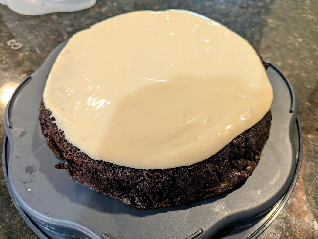 - Invert the first layer, and spread the frosting on top . Invert the other layer, add on top, and frost the top of the cake. Optionally sprinkle the top with shredded coconut flakes, chocolate chips, cocoa powder, sprinkles, or whatever you like