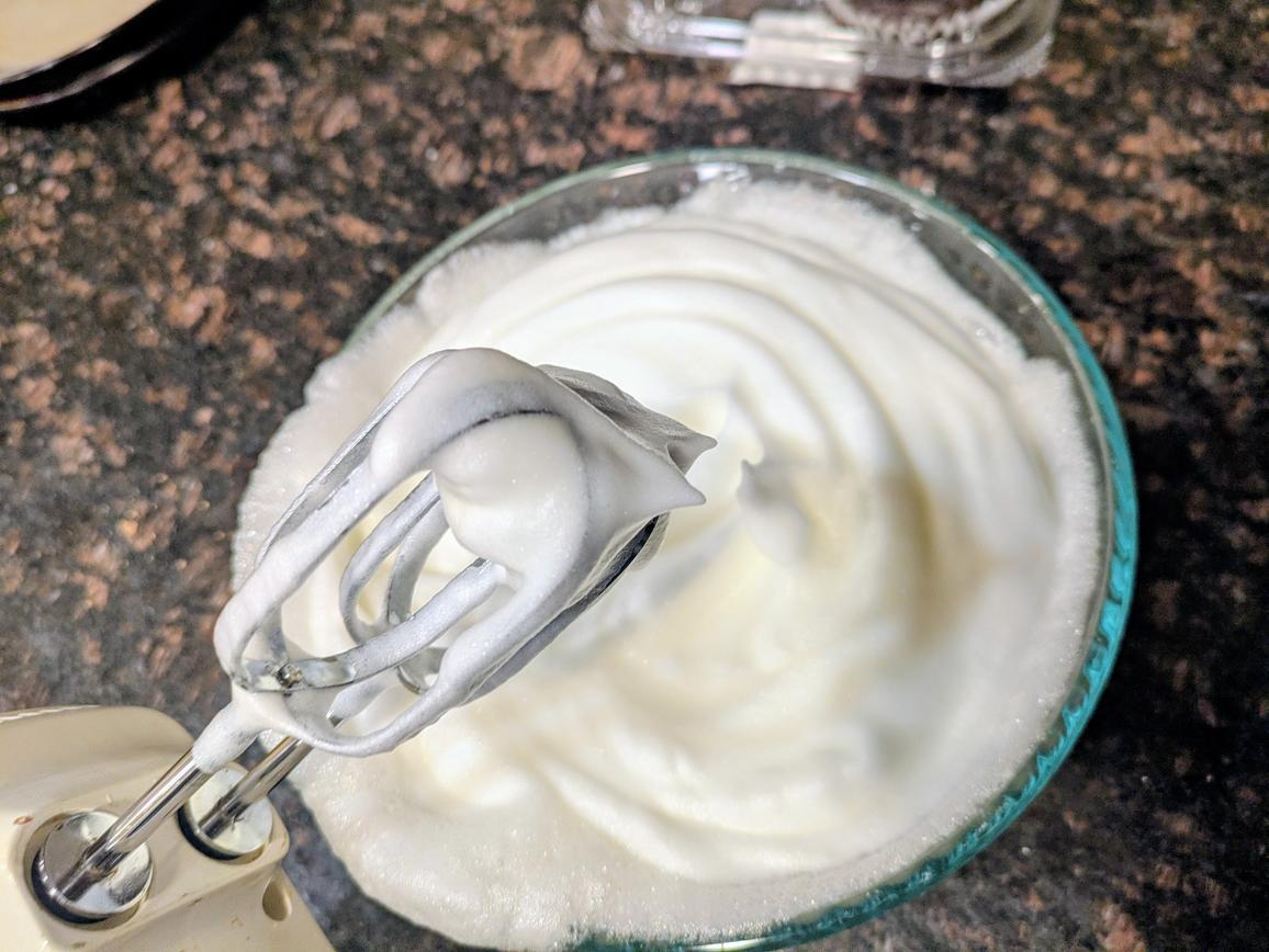 - In a large glass or metal bowl, whip your egg whites on high speed with a hand mixer for about 5 minutes, or until you have stiff peaks