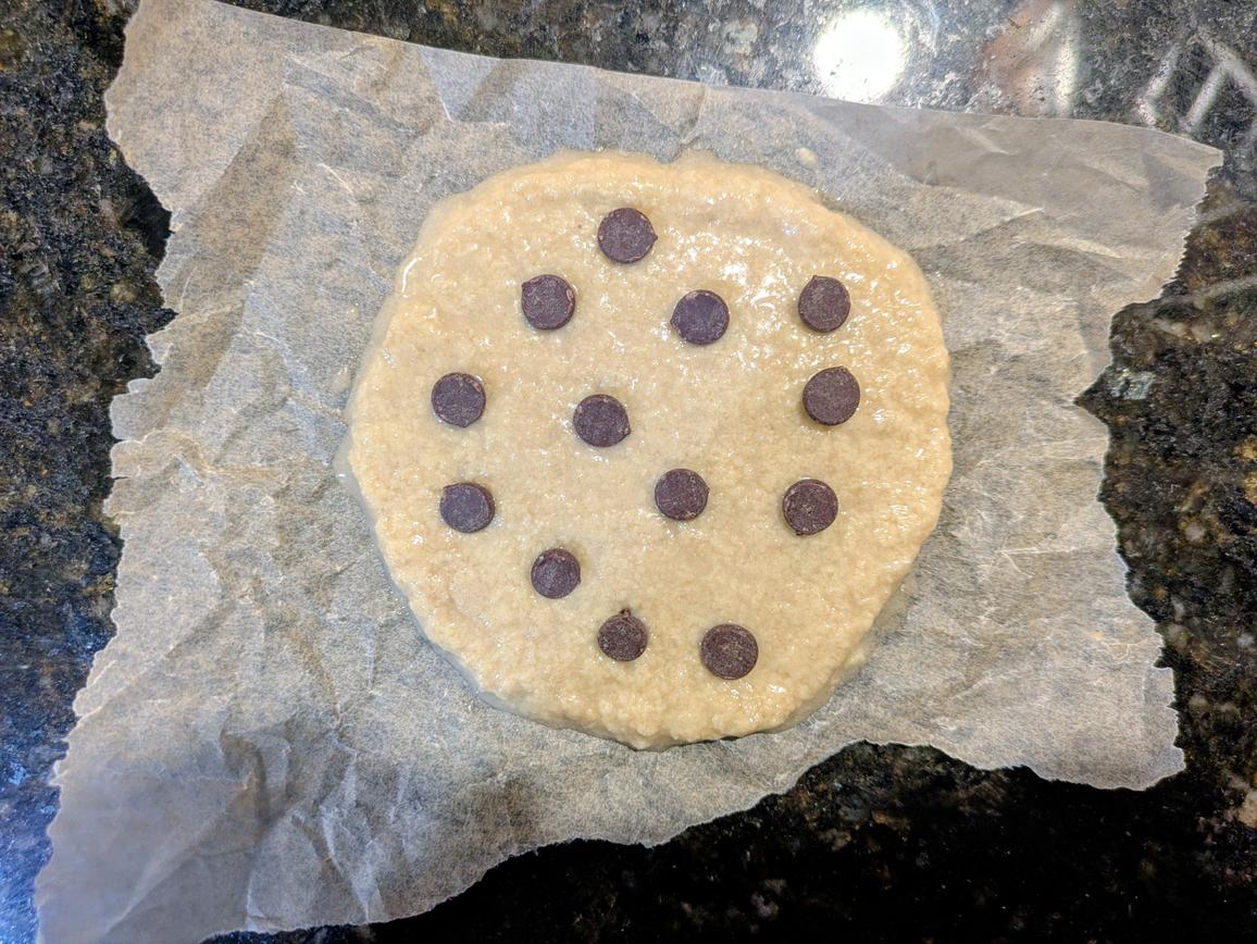 - Transfer your cookie dough to a small piece of parchment paper. Flatten to a 1/4" circle. Press the chocolate chips into the top