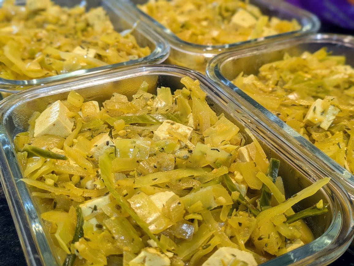 - Heat a large pot over medium heat. As the pot heats, finely cut your cabbage and onions