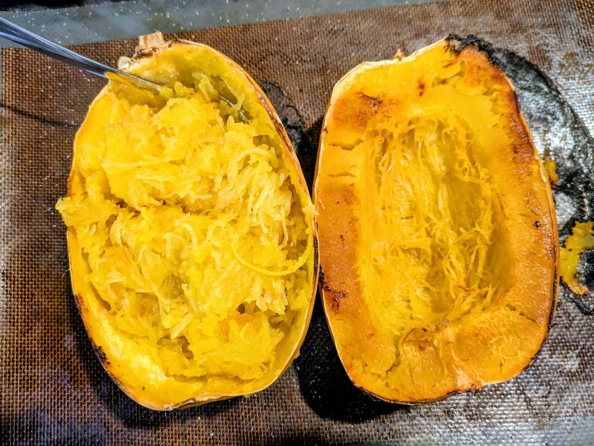 - Fluff the squash with a fork, keeping it in the skin and the skin intact. Add half your sauce to each half of the squash, and mix until fully combined. Top each half with half the cheese