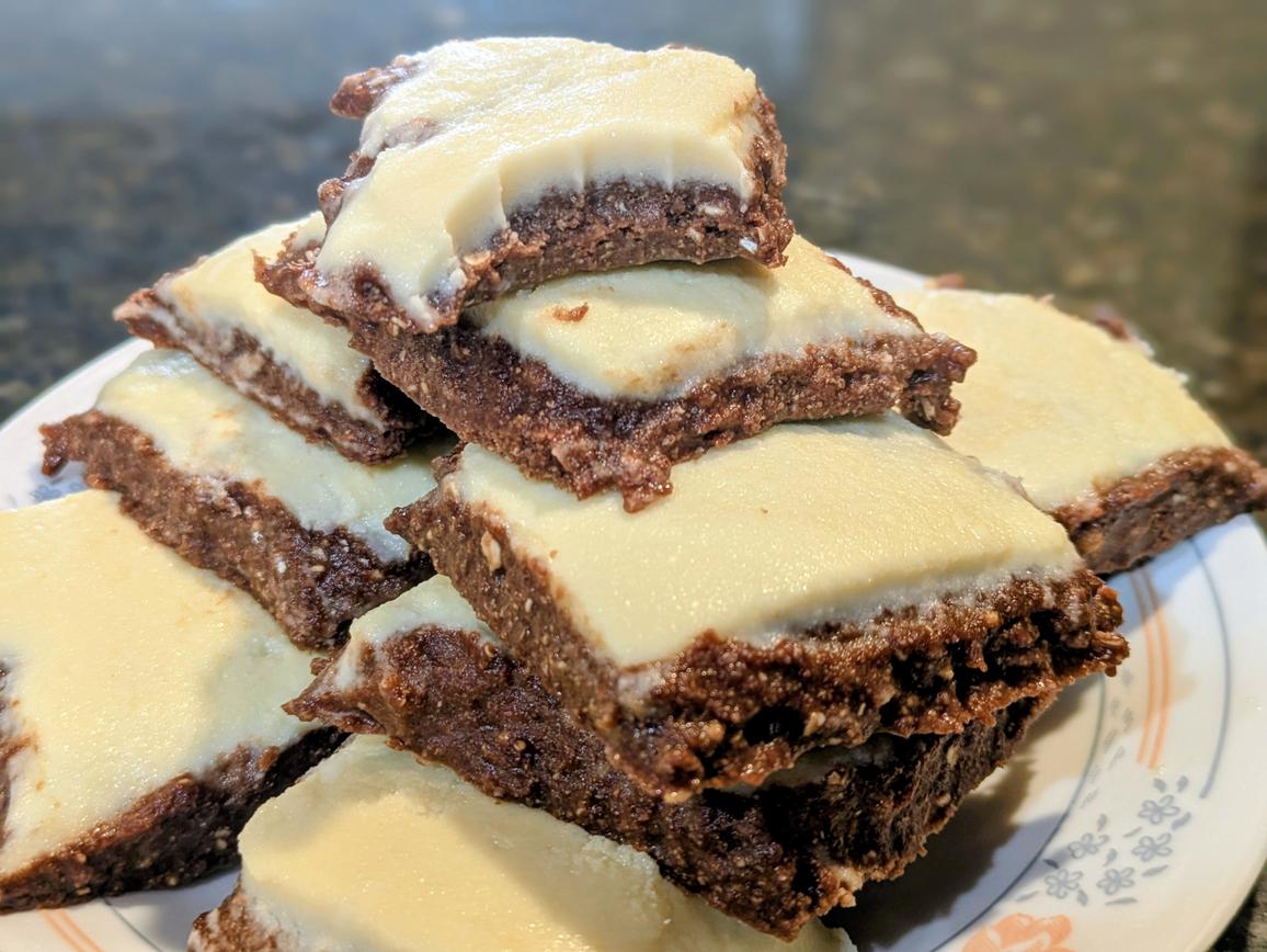 After making my Tangy White Chocolate with buttermilk powder and coconut oil, I wanted to put it to good use. What I came up with were these no bake white chocolate protein brownies. They feature a base of protein powder, carob powder, unsweetened applesauce, liquid monk fruit, oat flour, and coconut flour, all topped with a ganache made out of the homemade white chocolate. They're entirely sugar free - brownies and ganache included, only featuring liquid monk fruit as an external sweetener. Each bar packs 10 g of protein, along with 3 g of fiber and 6 g of fat, making one or two of these a great pre or post workout snack. For another no bake snack, check out my original No Bake Protein Brownies!