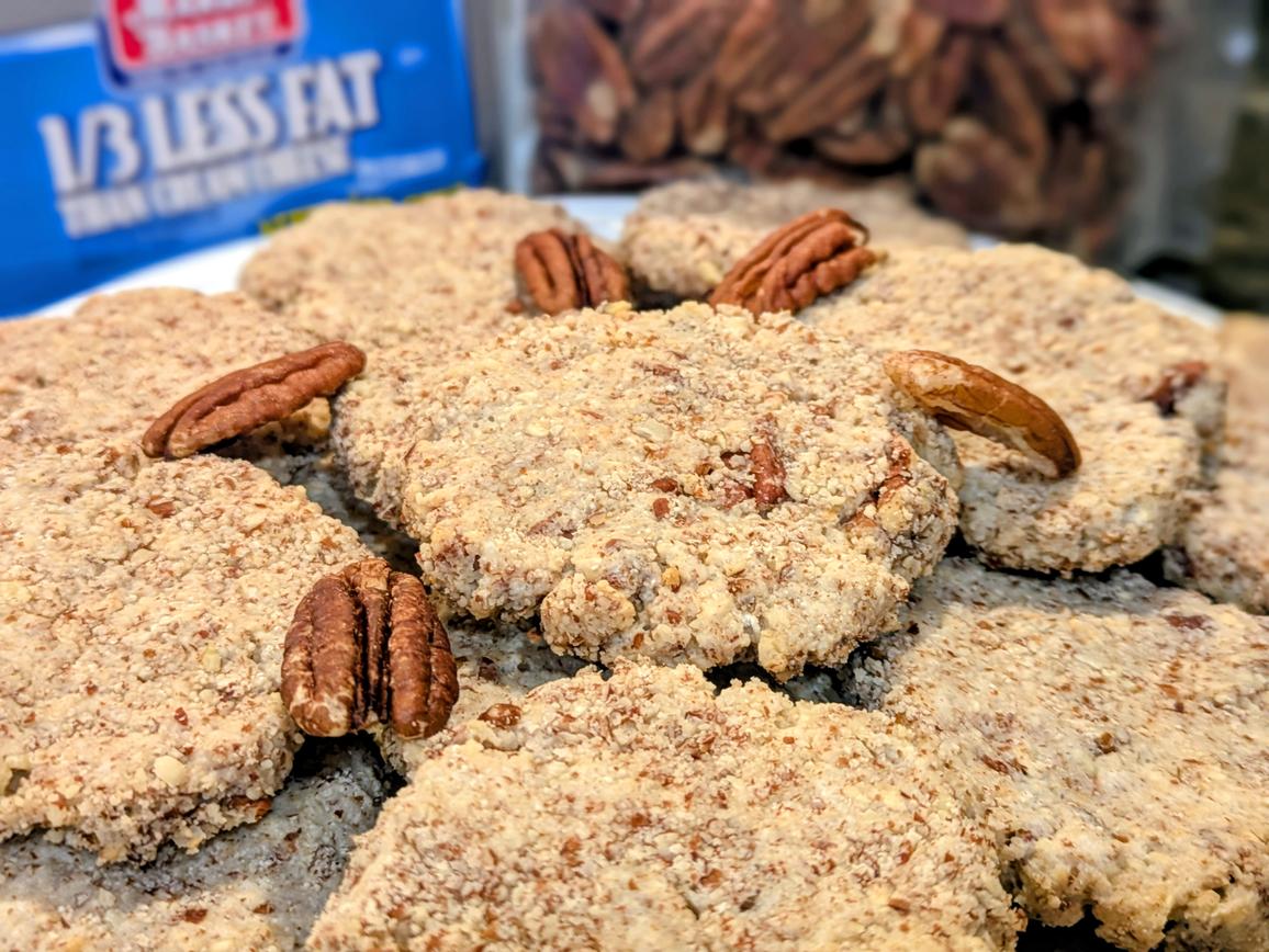 - Scoop your dough into 24 cookies, about 2 tbsp (31 g) in size. Lightly roll in the pecan meal, and add to the cookie sheet. Flatten down to about 1/4" thick. Lightly wetting your hands or using gloves helps to prevent the dough from sticking to your hands