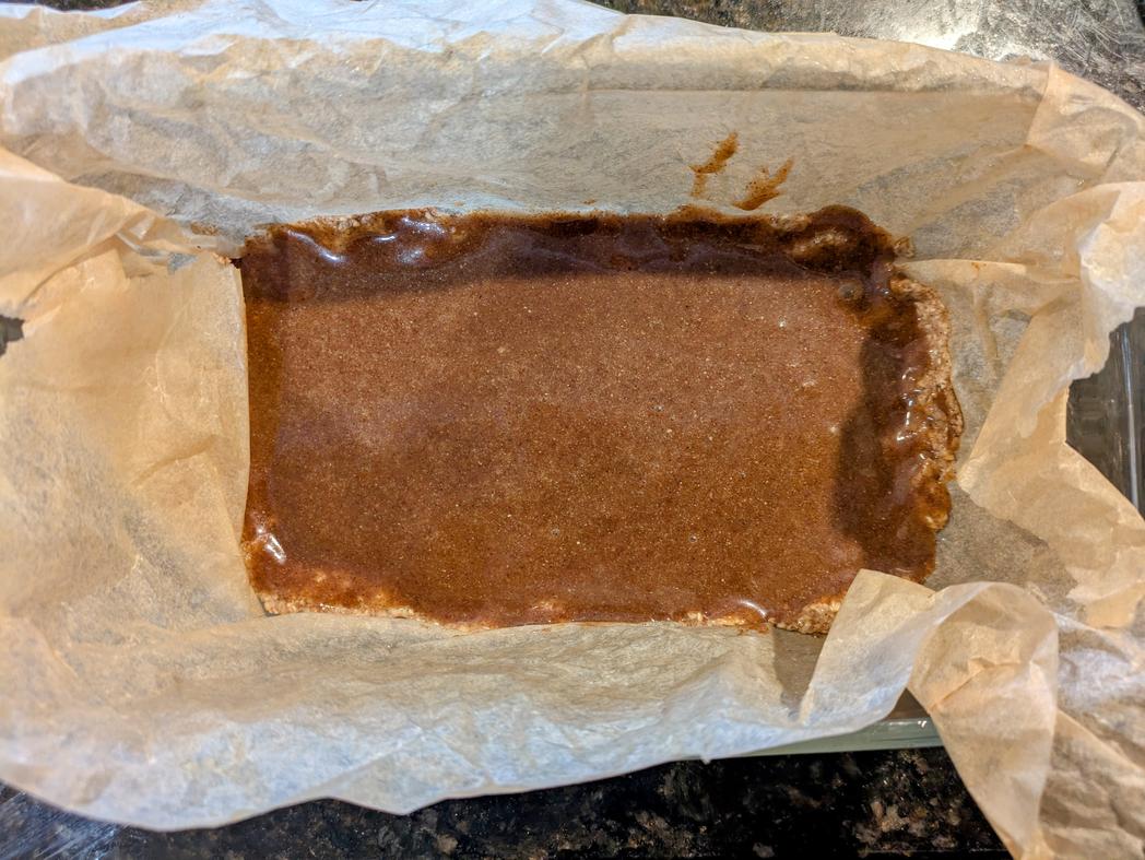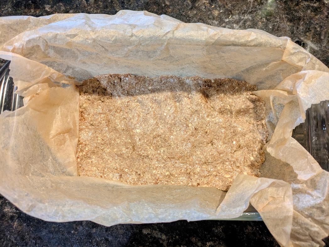- Line a 9x5" bread pan with parchment paper. Lightly wet your hands to prevent sticking, and evenly press the crust into the pan