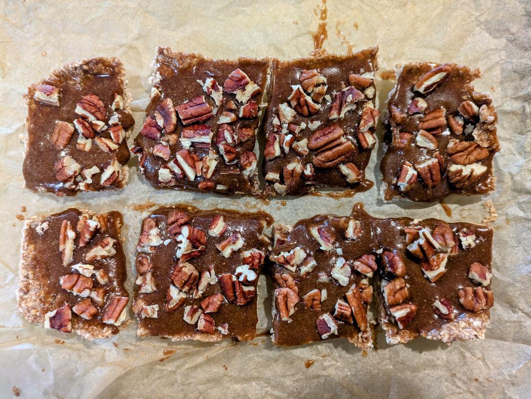 It's a little late for pecan pie season, but who cares? A good dessert is a good dessert. These no bake pecan pie bars feature an oat flour based crust, a honey filling, and a crushed pecan topping. It's refined sugar free, gluten free, and can be made vegan if using maple syrup or sugar free syrup