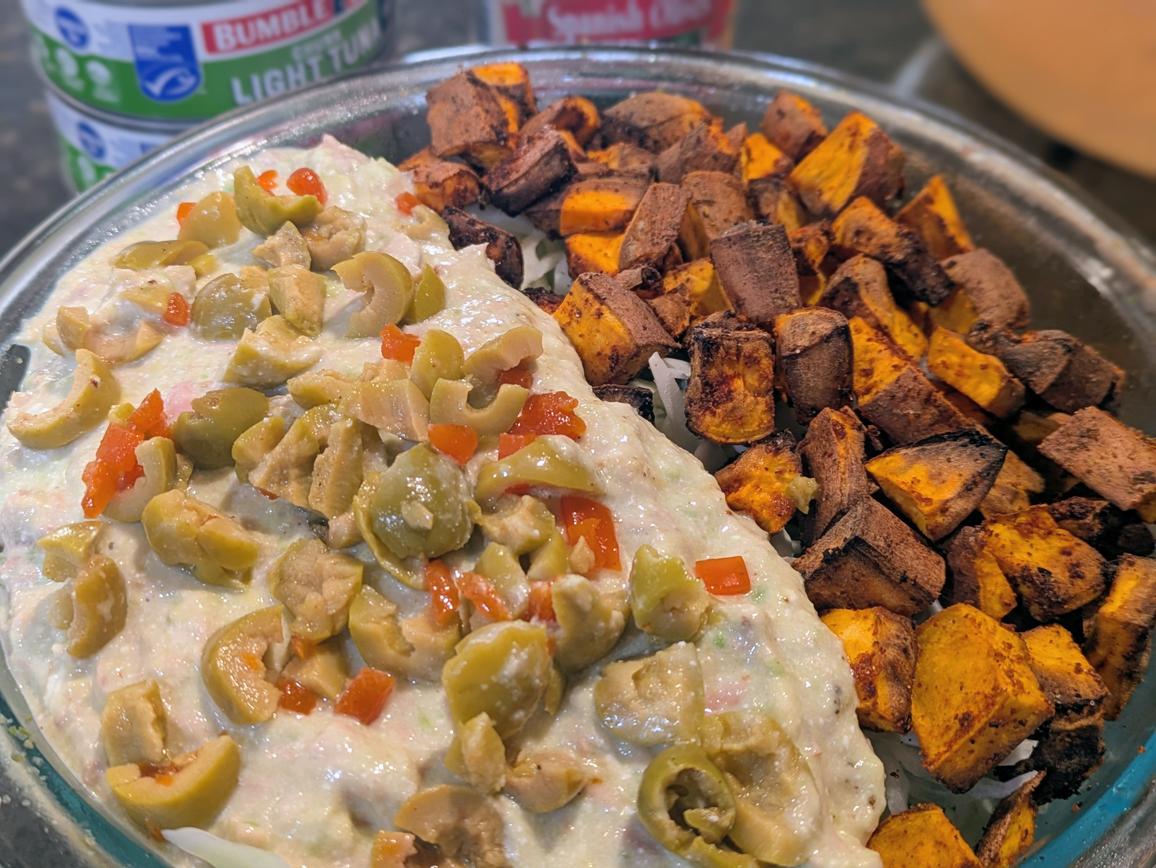 - Add your roasted sweet potatoes to one side of a bowl, and add your tuna mix to the other. Top with chopped olives