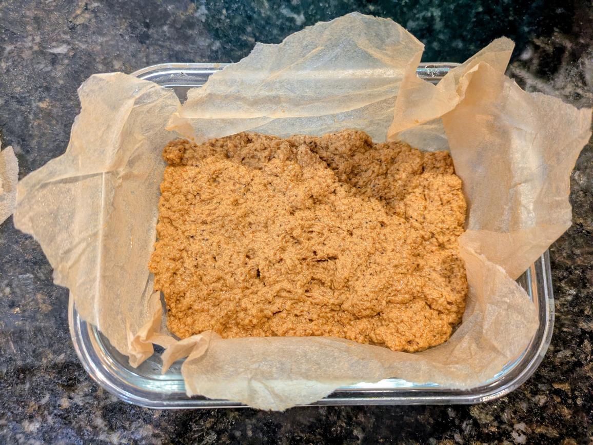 - You can also make baked seitan if you want to have a sliced "meat", instead of using the stovetop for ground "meat". Make the dough the same with the dry and wet ingredients listed above, but omit the water that's used for boiling. Line your pan with parchment paper, lightly grease with oil, and evenly press in the dough. I baked a half batch in a glass meal prep container, which is 6.2x4.5", but you can use a standard 9x5" bread pan for a whole batch. Bake at 325F for 1 hour