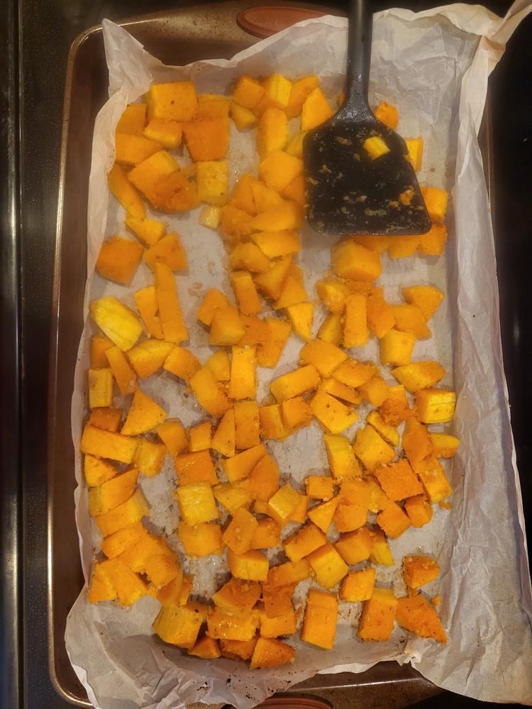 - Starting with the squash, peel it and slice in half. Scoop out the seeds, and cut into a large dice. Move the squash to a bowl, and season (oil, minced garlic, garlic powder, onion powder, pepper, and salt). One large butternut squash is the enough