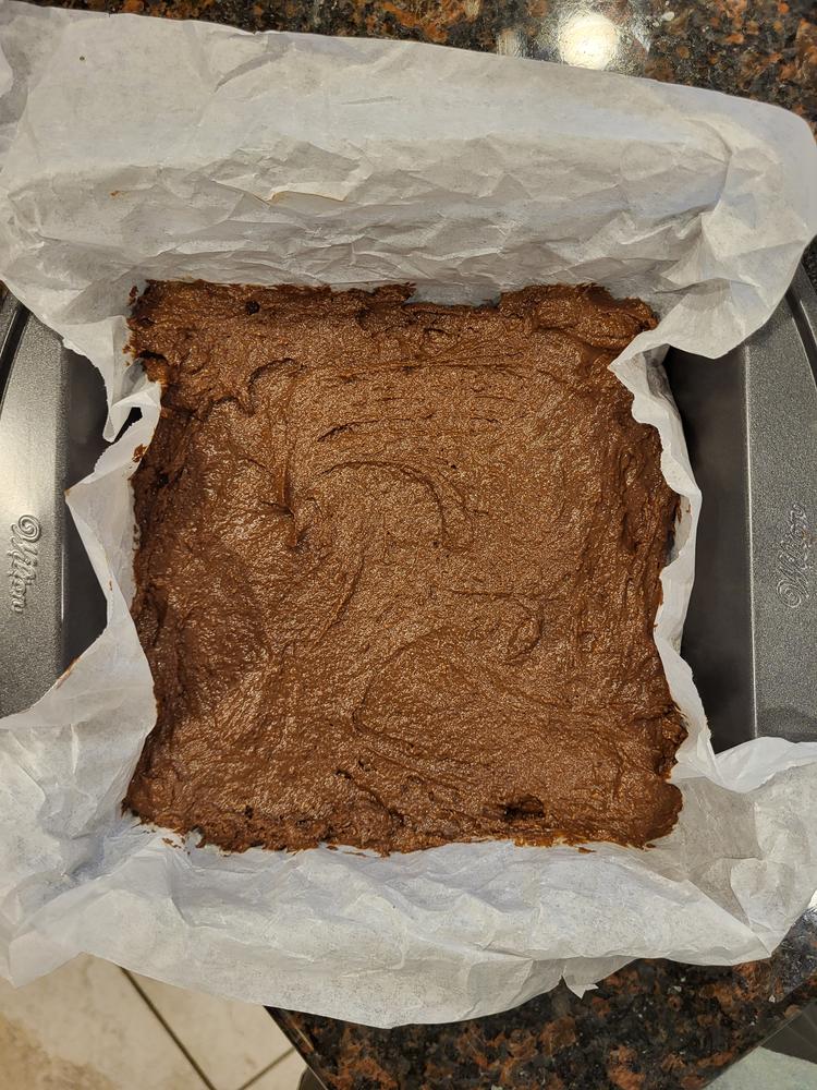 - Preheat your oven to 350F and line an 9" square baking pan with parchment paper. Optionally, spray the paper with oil