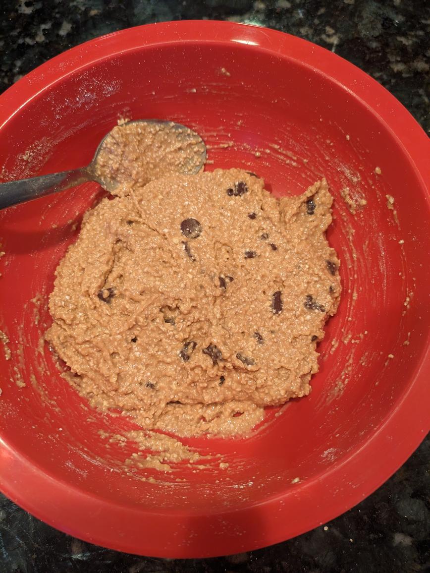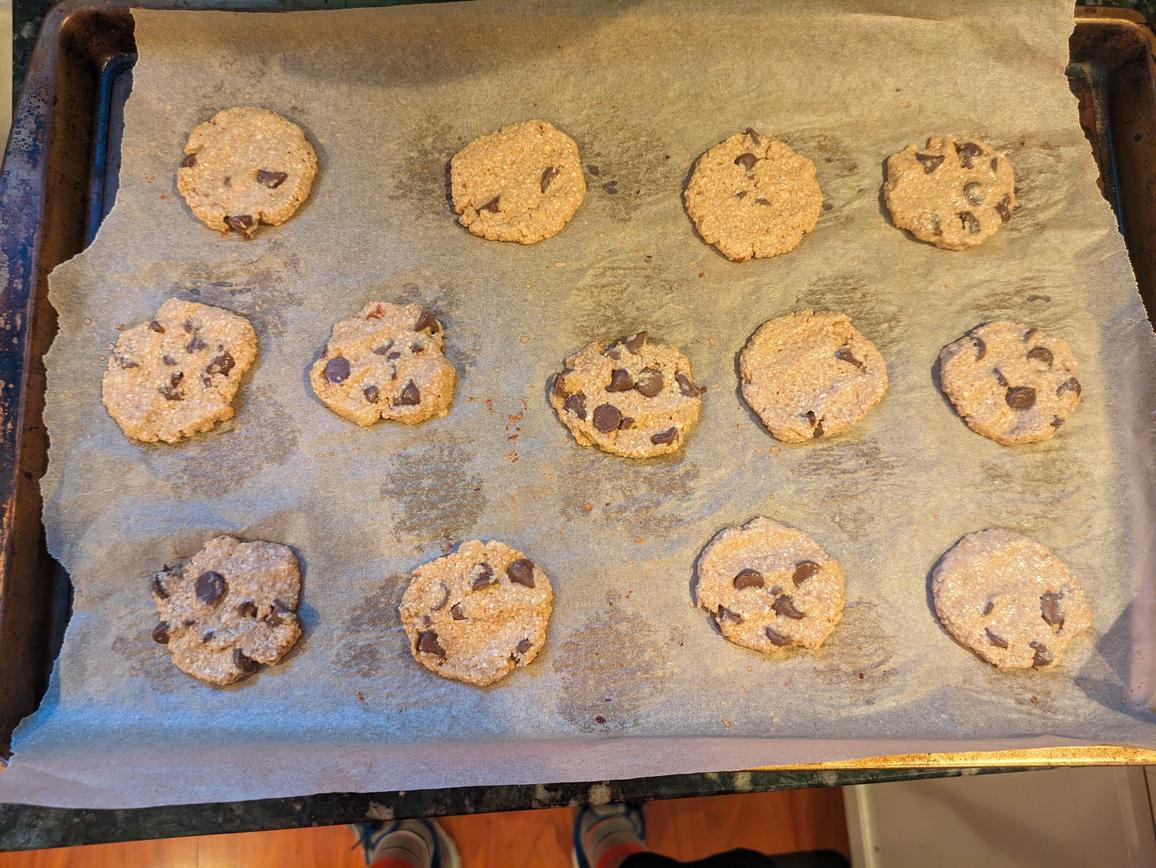 - Line a cookie sheet with parchment and preheat your oven to 350F. Scoop dough onto the sheet, and flatten into a cookie (they won't flatten or spread as they bake)
