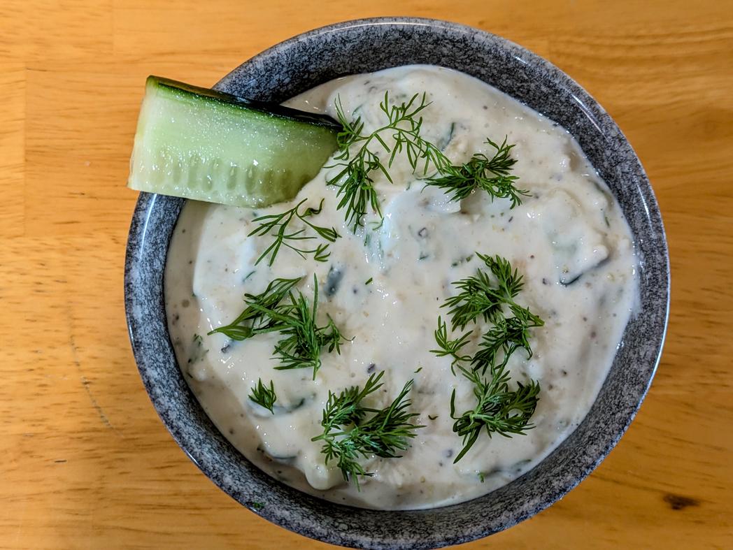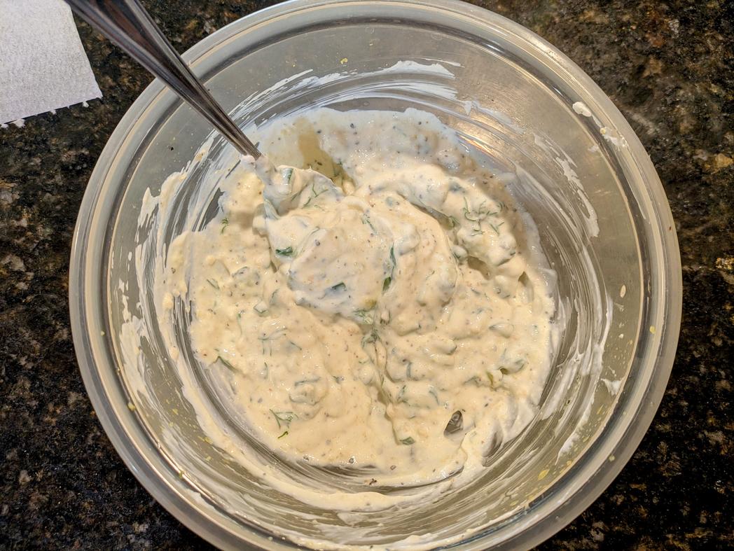 - Drain out the excess water. Add in the yogurt, lemon juice, minced garlic, garlic powder, onion powder, and fresh dill. Cover and refrigerate until ready to use