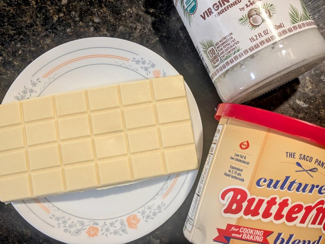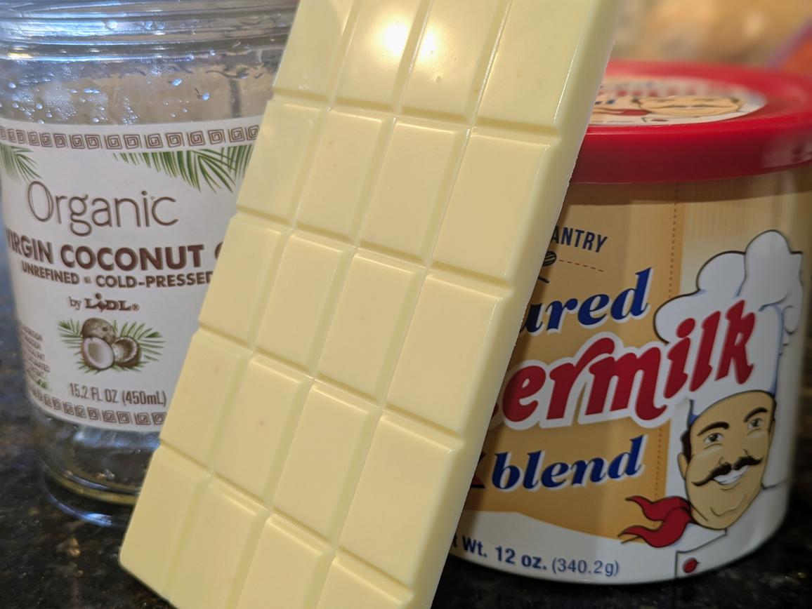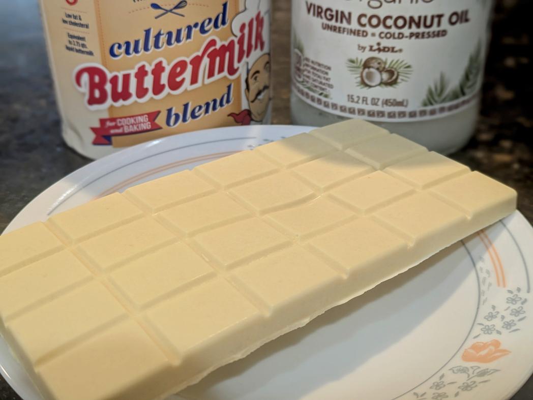 If you combine equal parts by weight of cocoa powder and melted coconut oil, you can easily make an unsweetened 100% chocolate bar with no added sugar. Well, today I'm swapping the cocoa powder for buttermilk powder, and adding in some vanilla extract. The result is an unsweetened white chocolate bar that mildly sweet from the natural milk sugars. This healthy candy bar is also slightly tangy and salty from the buttermilk, giving it more flavor. Try this chopped up into your next dessert or bowl of oatmeal to mix it up from normal chocolate chips!